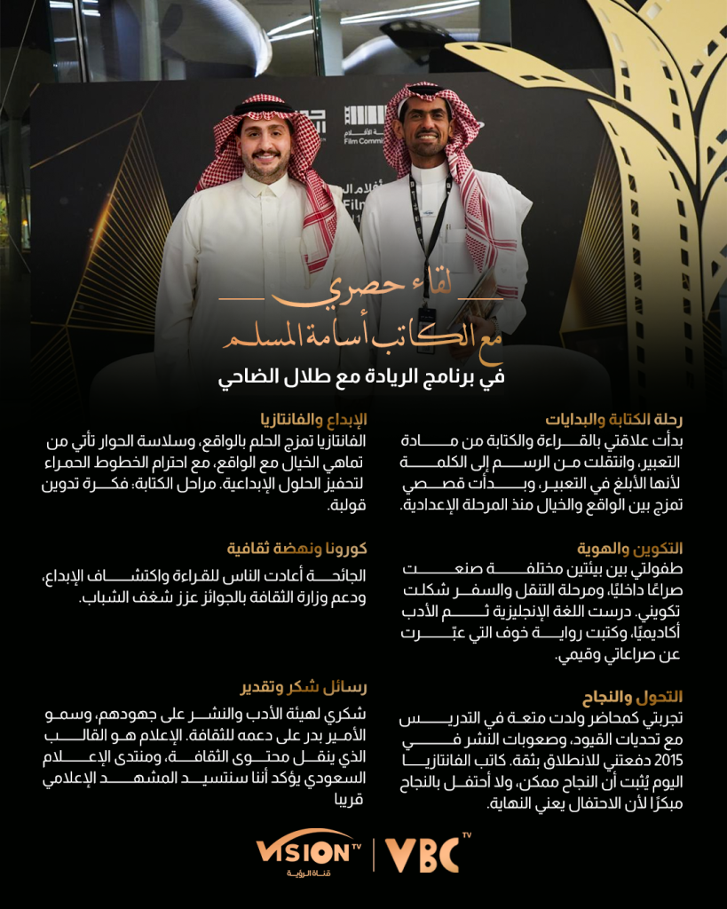 ولم يقتصر الحوار على الجوانب المهنية فحسب، بل امتد ليكشف البعد الإنساني في تجربة الضيف، حيث ناقش الضاحي مع المسلم مصادر الإلهام ودور القراءة والتجربة الشخصية في تشكيل وعي الكاتب وهويته الإبداعية، في رسالة ضمنية موجهة إلى الشباب الطامحين إلى دخول عالم الكتابة، تؤكد أهمية بناء صوت إبداعي مستقل بعيداً عن التقليد.